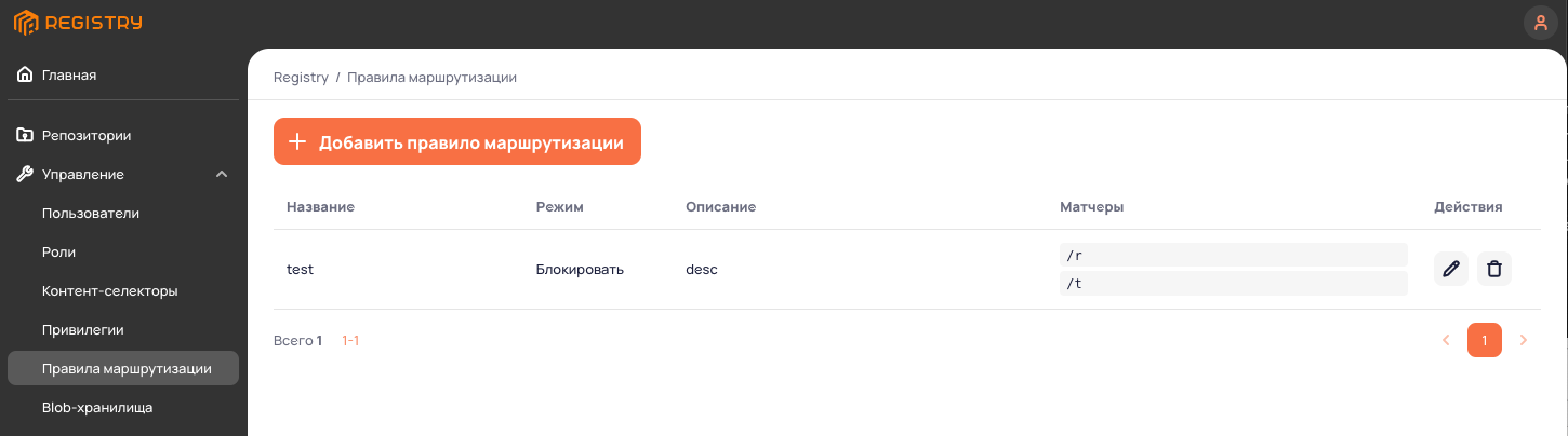 На странице Правила маршрутизации приведен список всех существующих в Системе правил маршрутизации. Каждое из них представлено в виде отдельной строки.